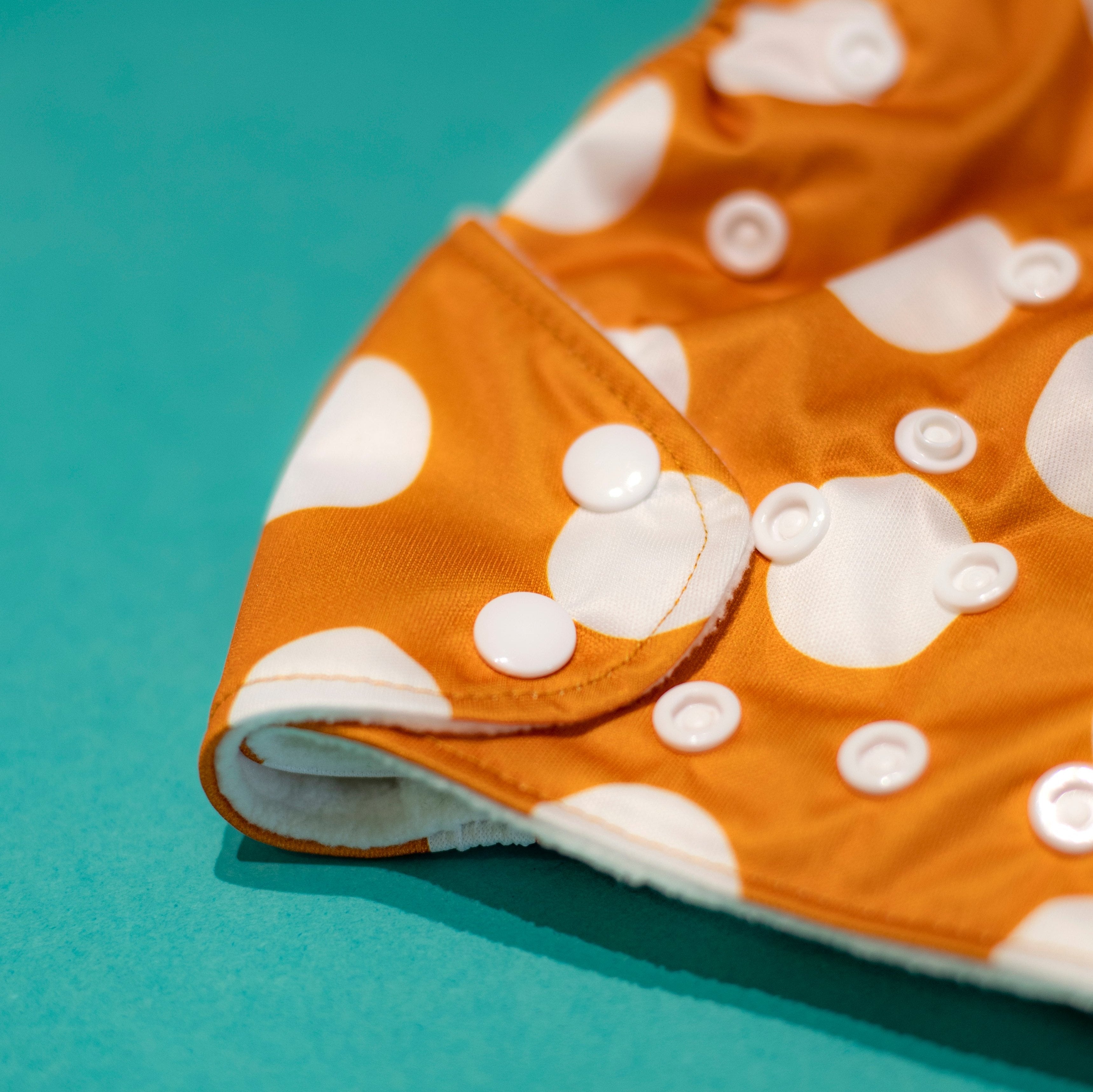 Acercamiento al color y patrón del pañal sostenible Ole ese Poo colocado sobre una superficie de fondo verde