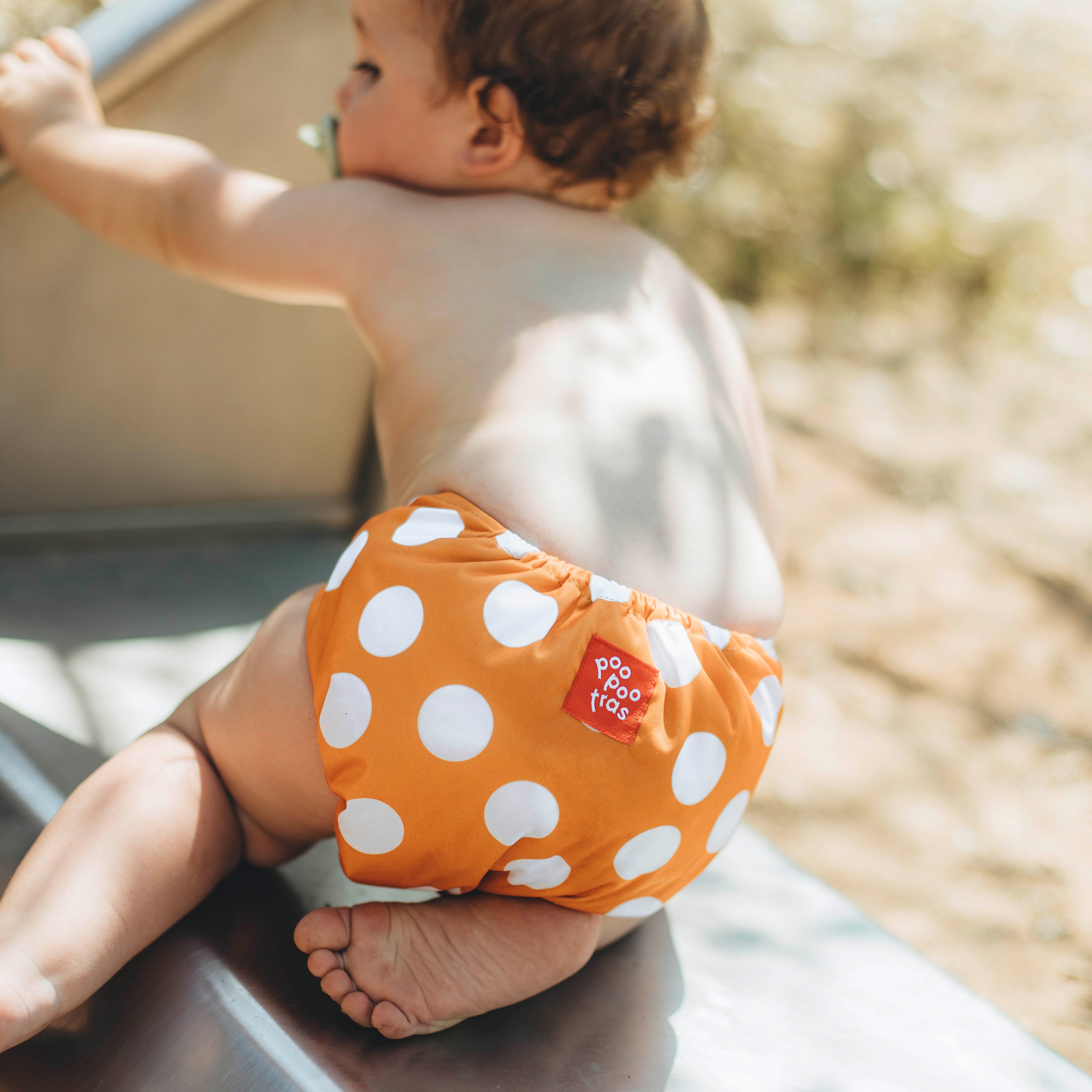 Pañales de tela reutilizable Ole ese poo llevado por un bebé jugando solo en el patio